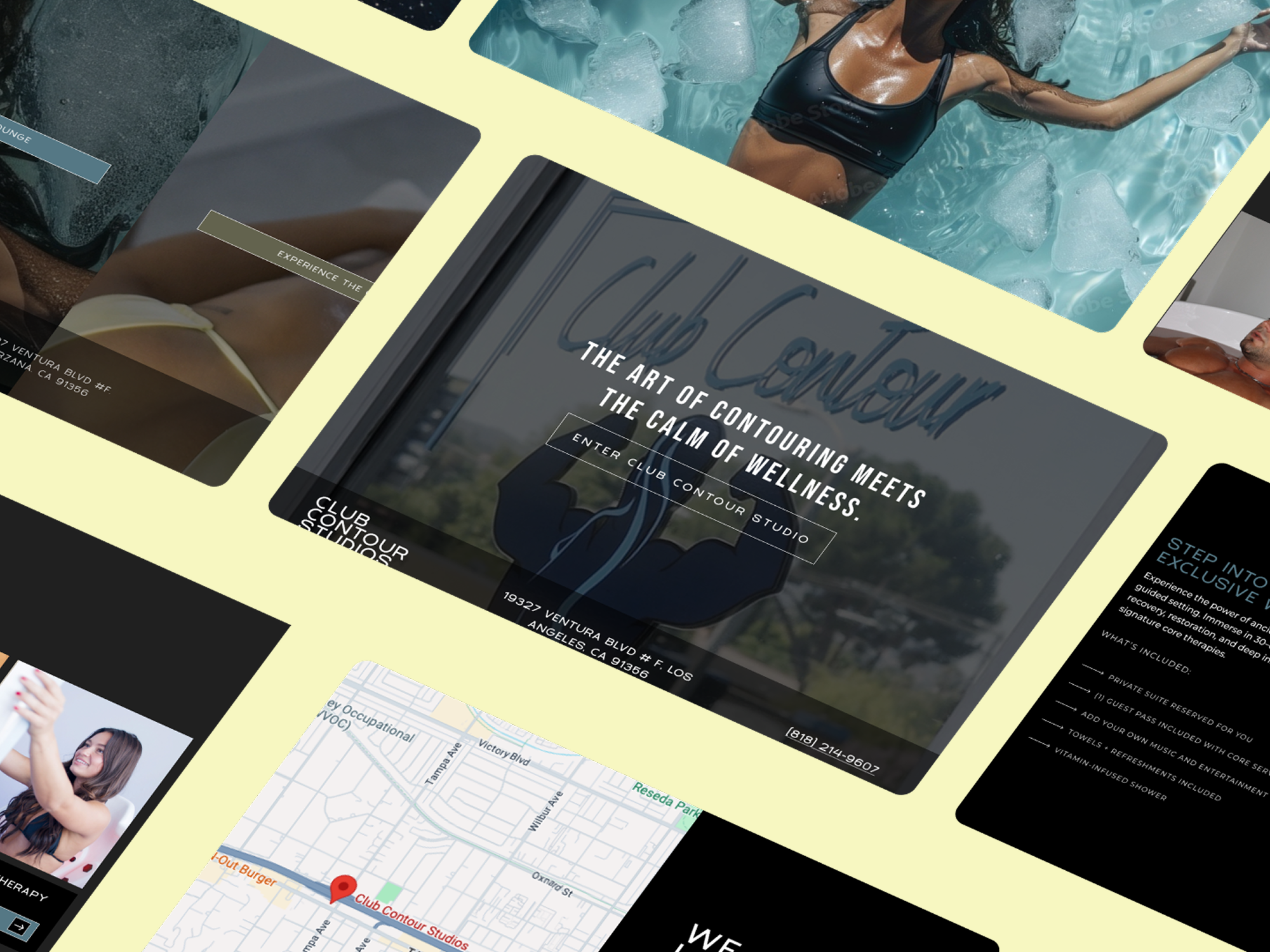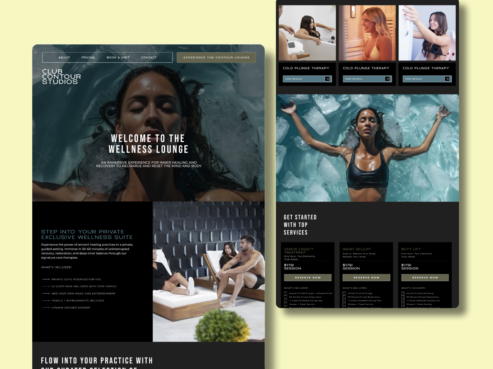 Club Contour Studios is a premium wellness and body sculpting studio in Tarzana, California, offering a deeply curated experience across two distinct lounges — the Wellness Lounge and the Contour Lounge. The challenge was to translate an elegant, serene Figma design into a Webflow website that authentically embodied the studio's luxurious atmosphere, while clearly communicating a rich range of services — from infrared sauna and cold plunge therapies to Venus Legacy body sculpting treatments — across a seamlessly navigable multi-page structure.