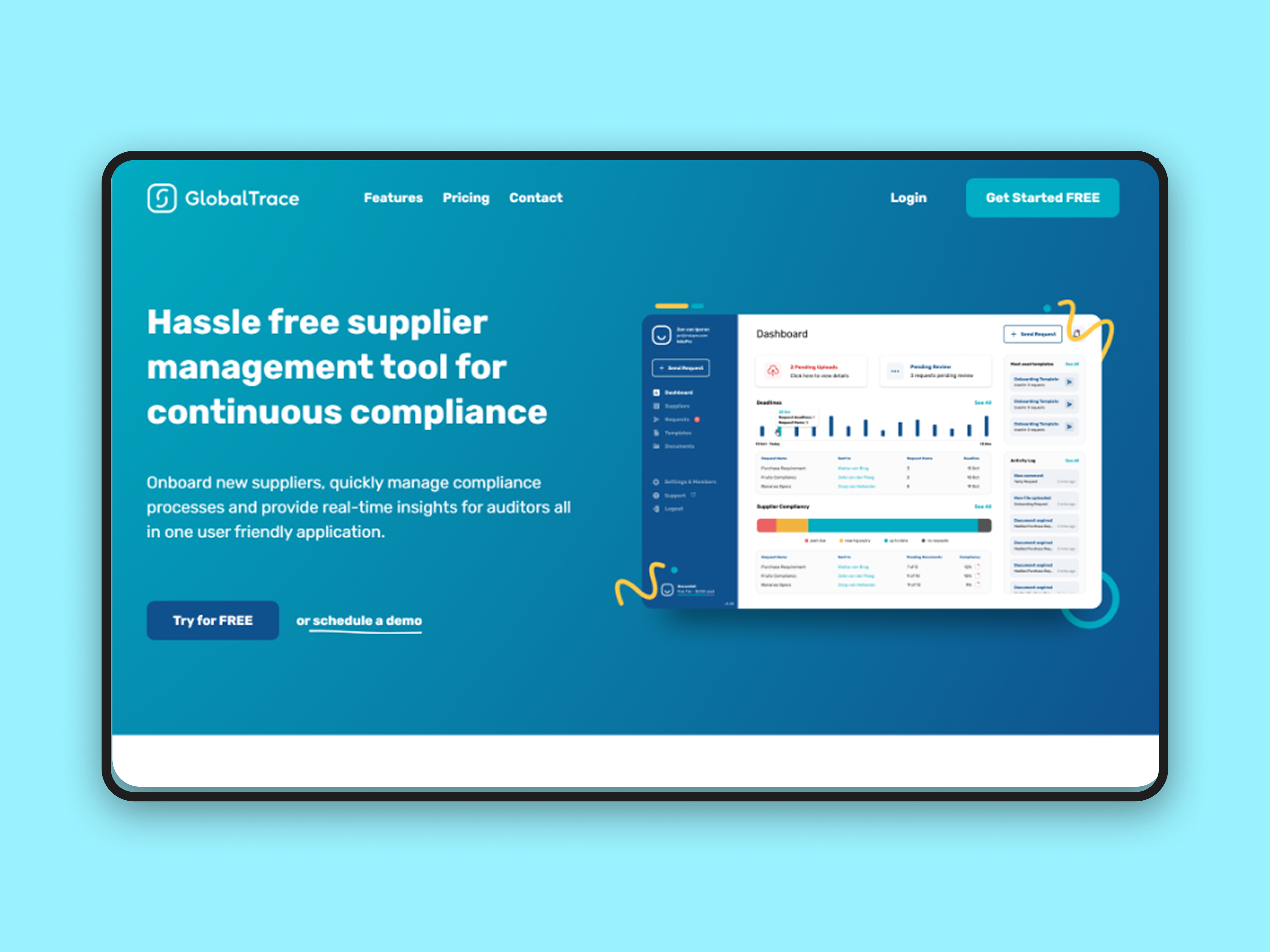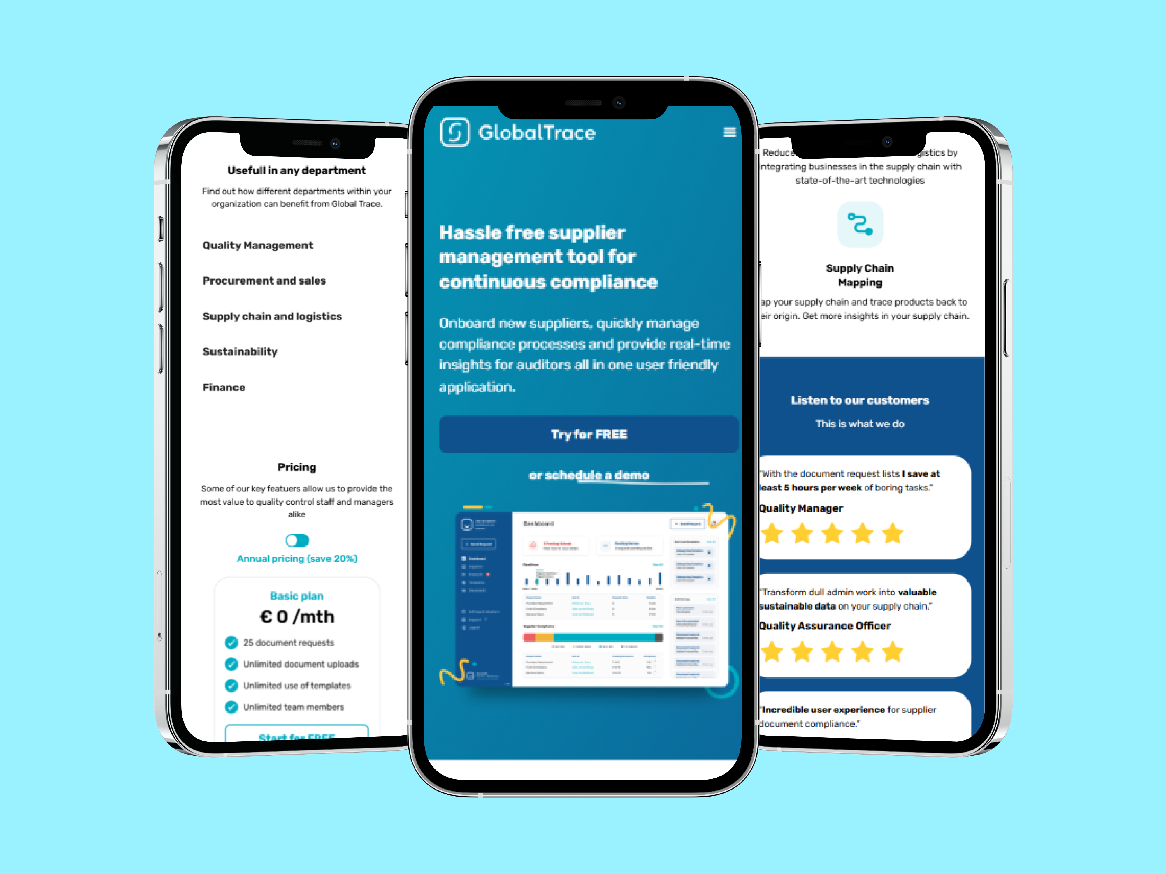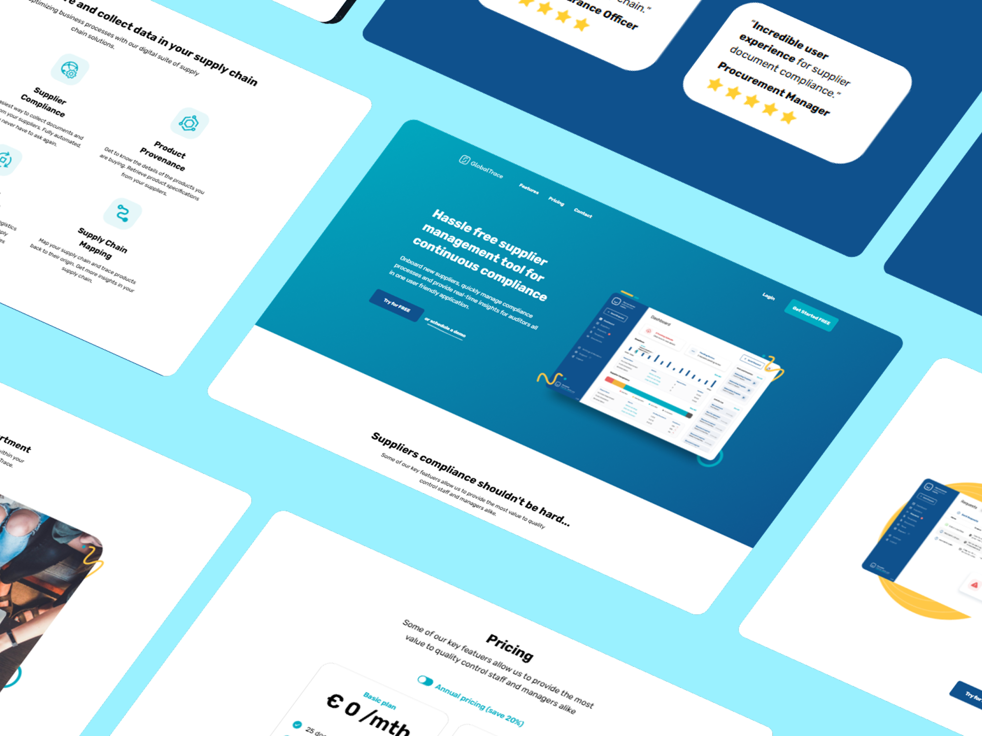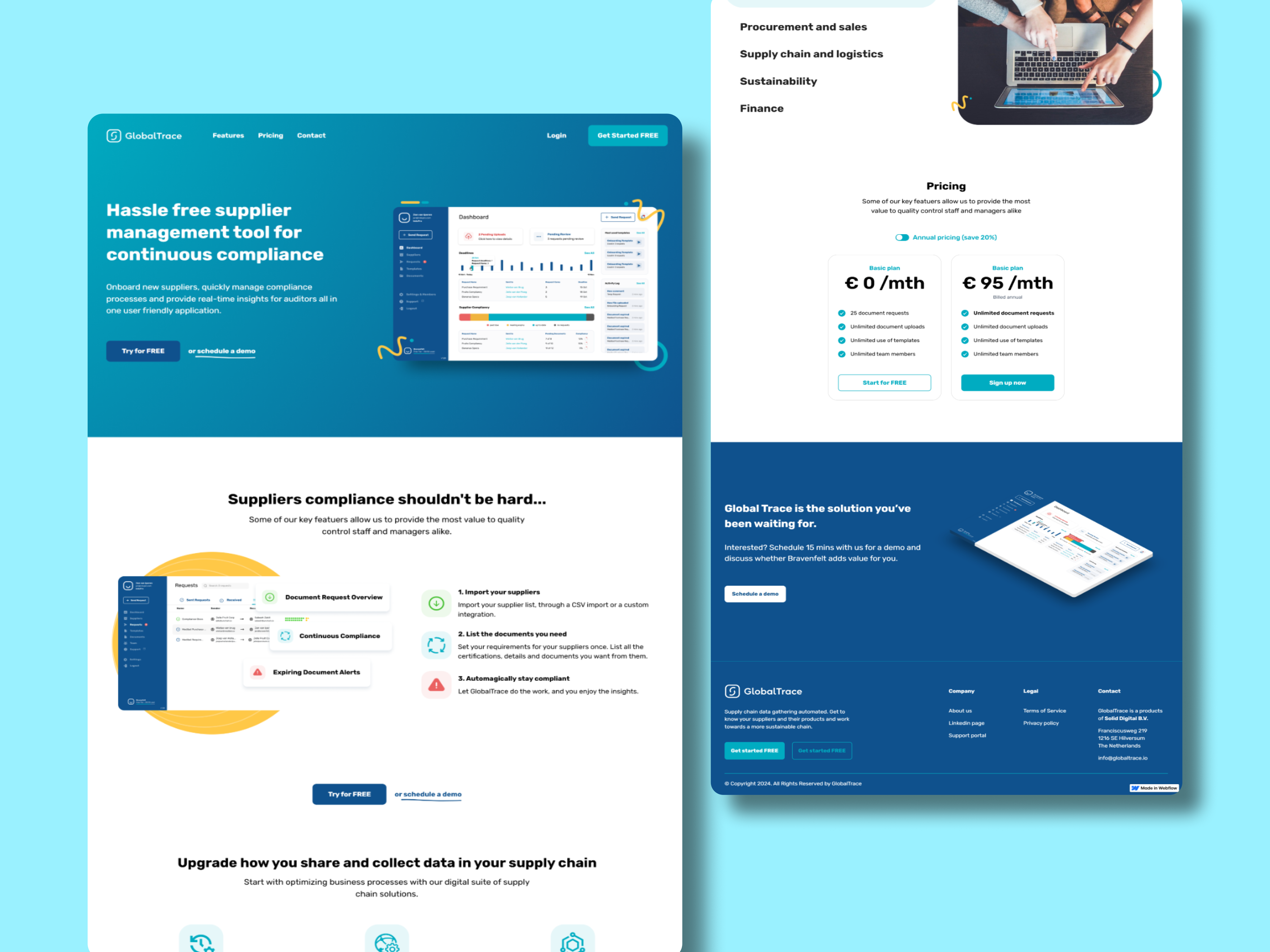 Global Trace is a supply chain compliance and traceability platform designed to help businesses map their supplier networks, manage risk, ensure regulatory compliance, and achieve end-to-end transparency across global supply chains. The challenge was to translate a technically detailed Figma design into a Webflow website that made a complex SaaS offering immediately understandable — communicating the platform's value to compliance managers, sustainability leads, and procurement professionals without overwhelming them with technical depth.
